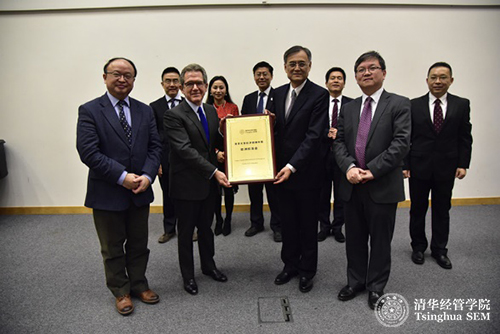 清華經(jīng)管學(xué)院歐洲校友會揭牌儀式(前排左起:中華人民共和國駐英使館教育公參沈陽,清華經(jīng)管學(xué)院顧問委員會名譽委員、L1 Energy(英國)公司主席、華為技術(shù)(英國)有限公司主席、英國BP集團前首席執(zhí)行官約翰·布朗勛爵(Lord Browne of Madingley),清華經(jīng)管學(xué)院院長錢穎一教授,清華大學(xué)全英校友會會長郭毅可教授)(圖片來源:清華經(jīng)管學(xué)院)