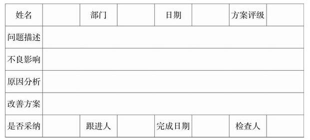 一個企業(yè)團隊的創(chuàng)新需要發(fā)揮每個人的智慧,為了提高每個團隊成員的創(chuàng)新積極性,推行改善提案是一種非常有 效的方法。這種方法的重點就是讓每一個團隊成員定期向企業(yè)反映一些自己發(fā)現(xiàn)的問題,并對這些問題提出改善的建議。 推行這種方法關(guān)鍵在于團隊領導者要認真對待每一個提案,并對每個人提出的提案及時進行回復。對一些的確有利于改善 工作績效和團隊發(fā)展的建議,要將其及時轉(zhuǎn)化為制度,從而最大限度地發(fā)揮改善提案的價值。表2是一份改善提案表,以 供參考。