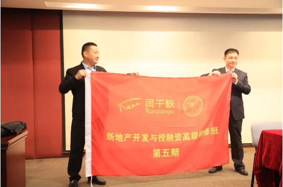 接著,張春江鄭重地宣布:“地產(chǎn)五期,開班!”。他為地產(chǎn)五期授予班旗,潘洪巖代表班級接旗。班旗的展開標(biāo)志著地產(chǎn)五期正式成立,從此揚帆起航。